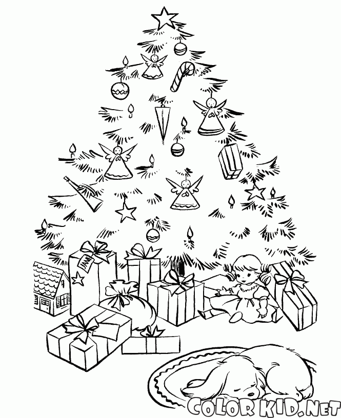 Kolorowanka - Zwierzęta zasnęła w pobliżu choinki